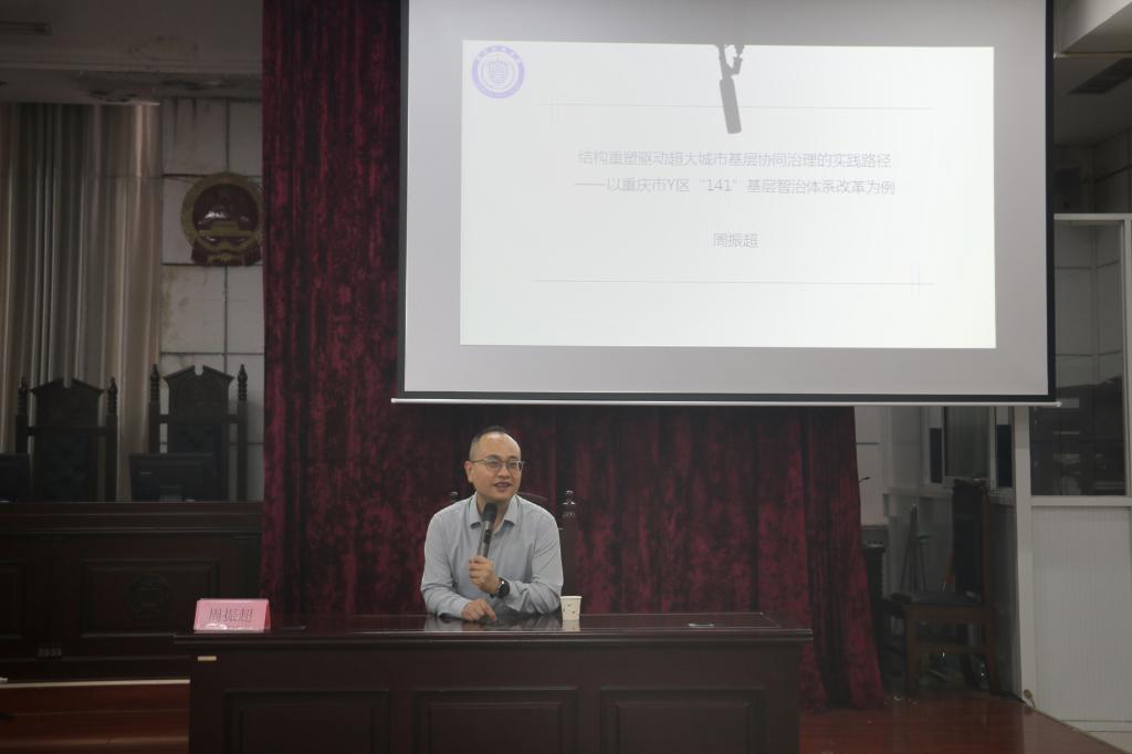 为深化跨学科学术交流、共同探讨超大城市基层治理的实践难题与理论前沿,9月27日下午,法学院与政治与公共管理学院在JS328联合举办“结构重塑驱动超大城市基层协同治理的实践路径”学术讲座。本次讲座作为我校70周年校庆、政治教育65周年、法学教育30周年系列学术活动之一,特邀重庆警察学院党委委员、副院长周振超教授主讲,政治与公共管理学院秦绪娜教授主持,两院师生代表参与交流。