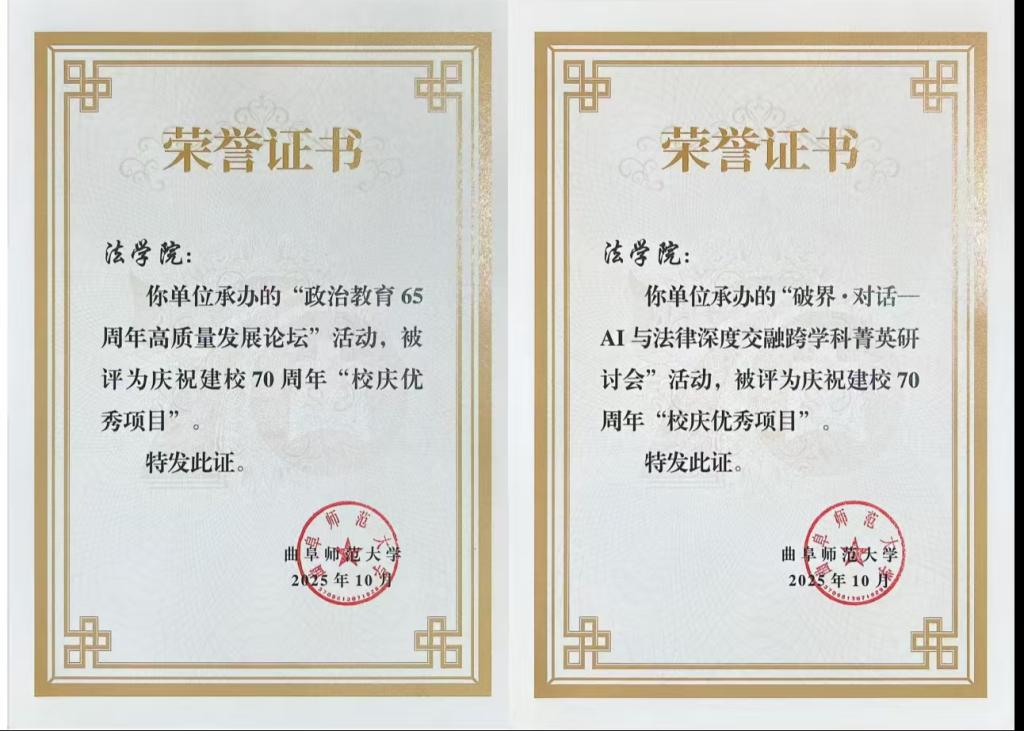 恰逢学校70华诞,亦是法学院建院20周年、法学教育30周年的重要节点。我院积极投身校庆筹备,精心打造系列特色活动,成果喜获肯定——“政治教育65周年高质量发展论坛”“破界·对话—AI与法律深度交融跨学科菁英研讨会”获评“校庆优秀项目”,徐晓文、解艳林、张忠思三位教师荣获“校庆工作先进个人”称号。