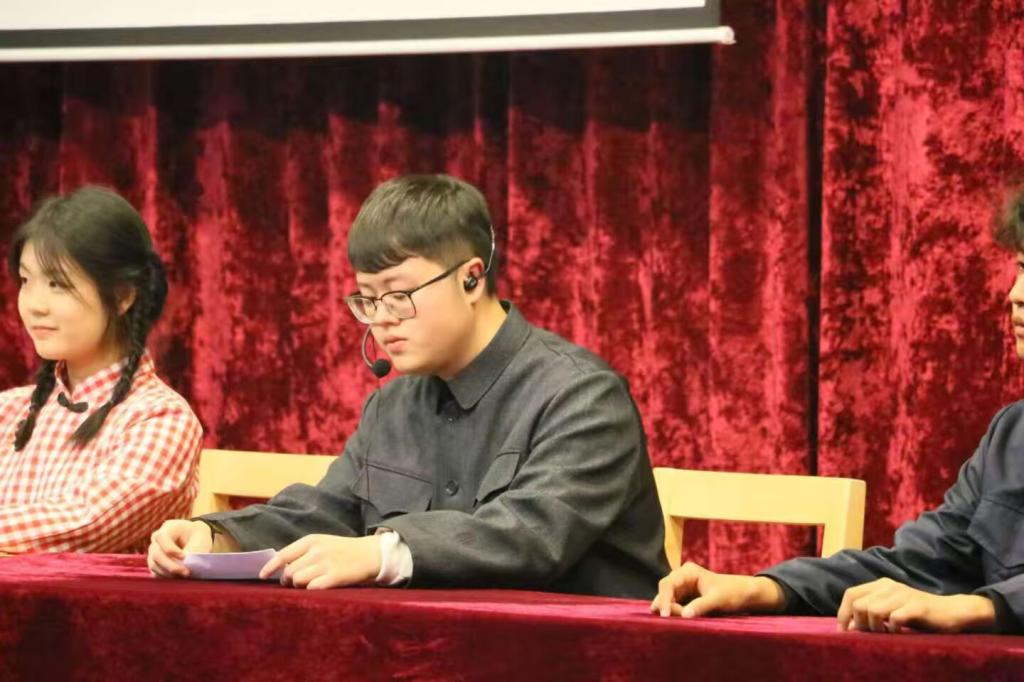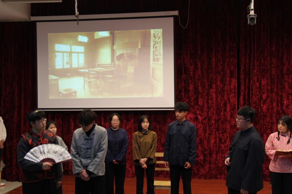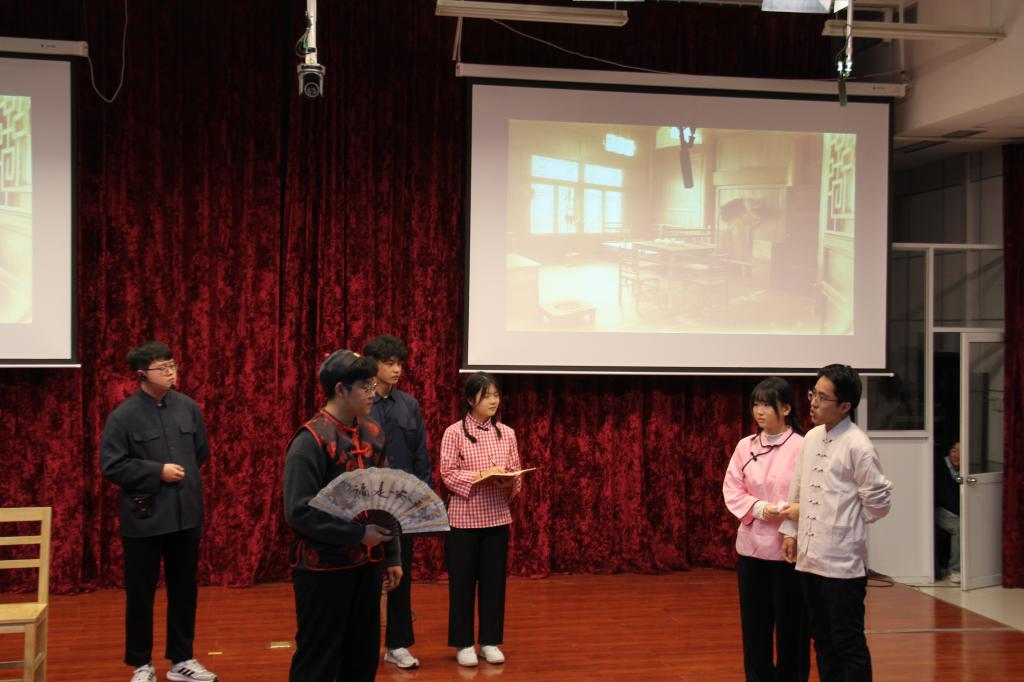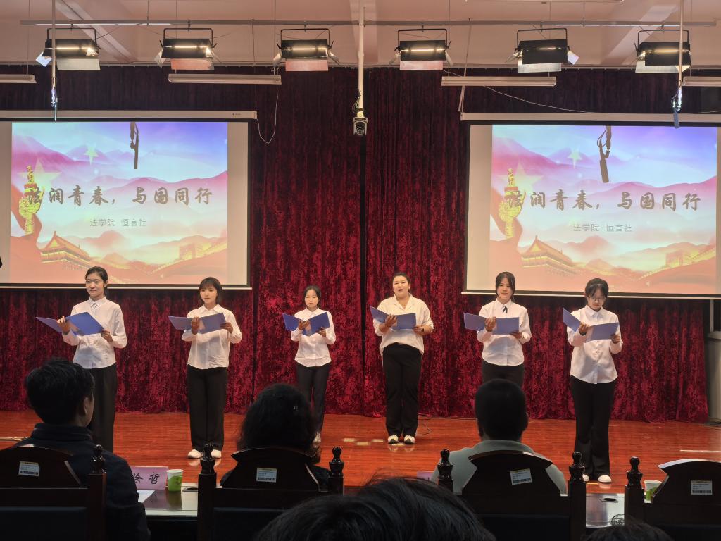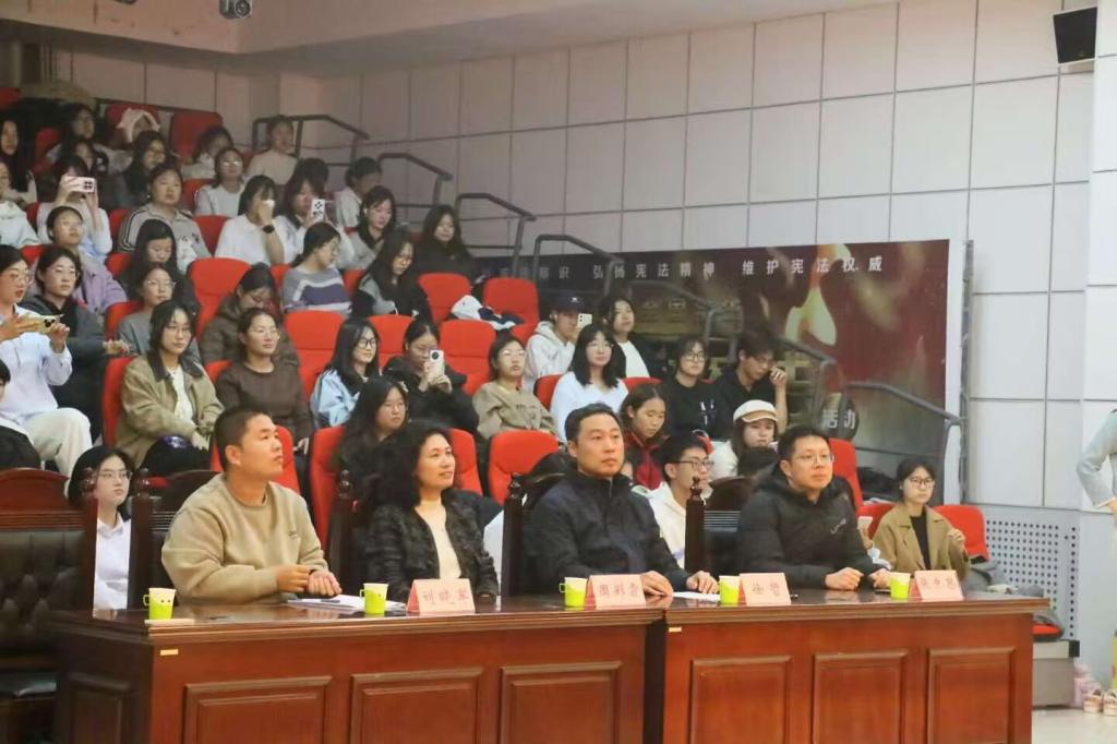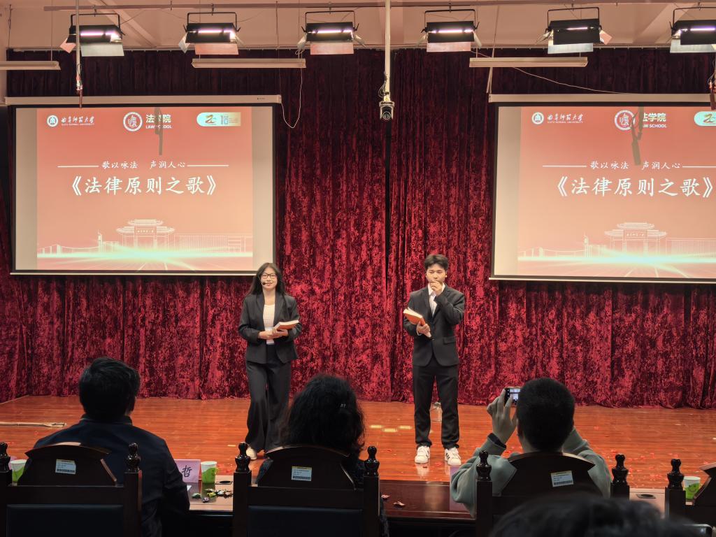 文艺表演环节精彩纷呈,三大特色节目轮番上演,为现场观众带来了一场兼具思想深度与观赏质感的视听盛宴。朗诵《法润青春,与国同行》以铿锵有力的语调、真挚饱满的情感,诠释对法律精神的坚守与敬畏,传递出“青春与法治同行”的坚定信念。话剧《法脉·民心:马锡五审判》话剧表演精彩亮相,该剧聚焦经典“封捧儿抢婚案”,还原马锡五携卷下乡,深入群众调查的场景,直观演绎了婚姻自由的法治理念,深刻诠释出民法典中“婚姻自愿”的核心条款,让师生真切感受到法治的温度与力量,理解传统法治智慧对现代司法实践的深刻启示。最后,歌曲《法律原则之歌》以旋律为纽带,用悠扬的歌声让抽象的法律知识变得鲜活可感,进一步深化了师生对法治精神的理解和认同。